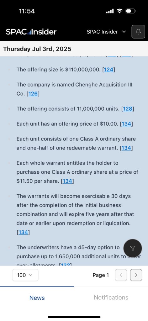 Take, for example, this view of Chenghe III‘s (NASDAQ:CHECU) new S-1 filing. When viewing the S-1 in the app, each of the key terms is summarized in a footnote. Each of these footnotes also contains links that will take you directly to the portion of the filing that is being referenced in the summary so that you may review that section in full.